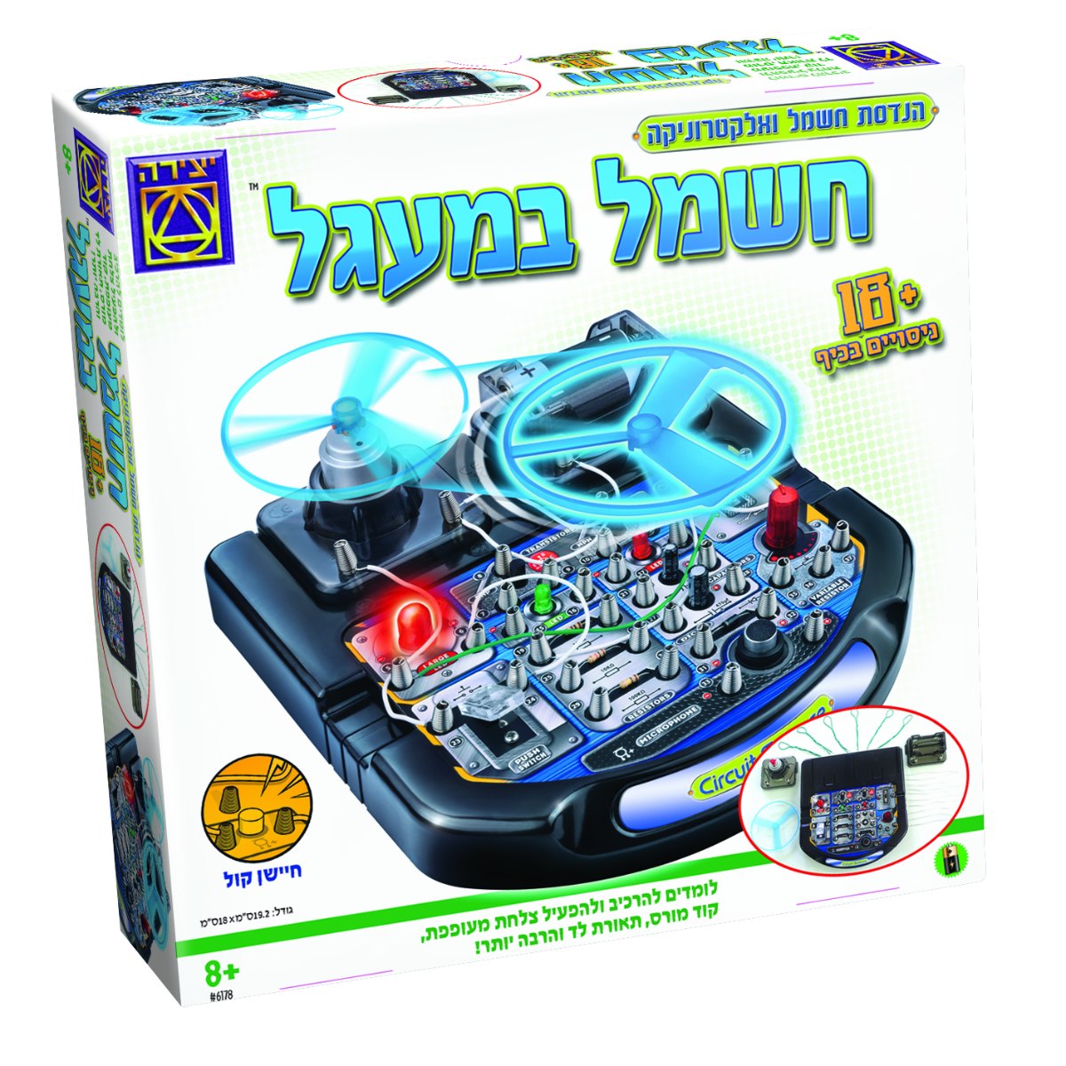“חשמל במעגל” ערכת יצירה מסדרת פיזיקל בנושא הנדסת חשמל ואלקטרוניקה המכילה יותר מ18 ניסויים שונים מבית “יצירה”.