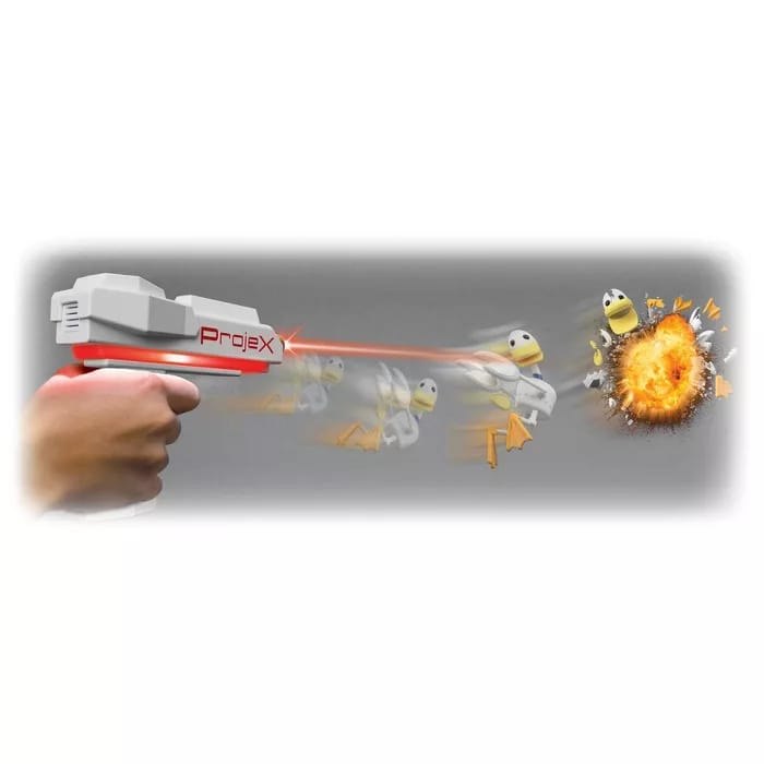אקדח לייזר X לקיר מגיע עם מקרן ודמויות שמופיעות על הקיר וצריך לפגוע בהם. מתאים ליחיד או לזוג